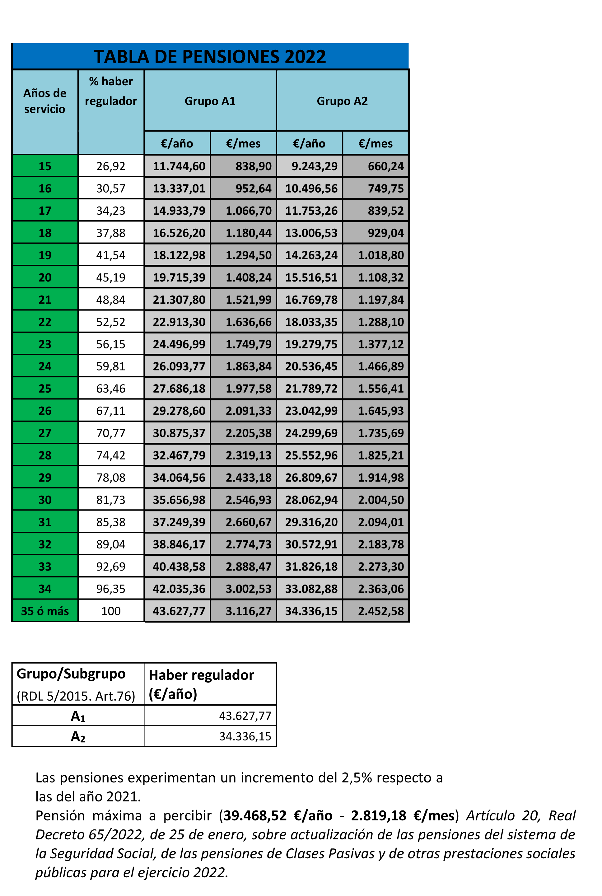 Revalorización de las pensiones de Clases Pasivas para el 2022. Tabla